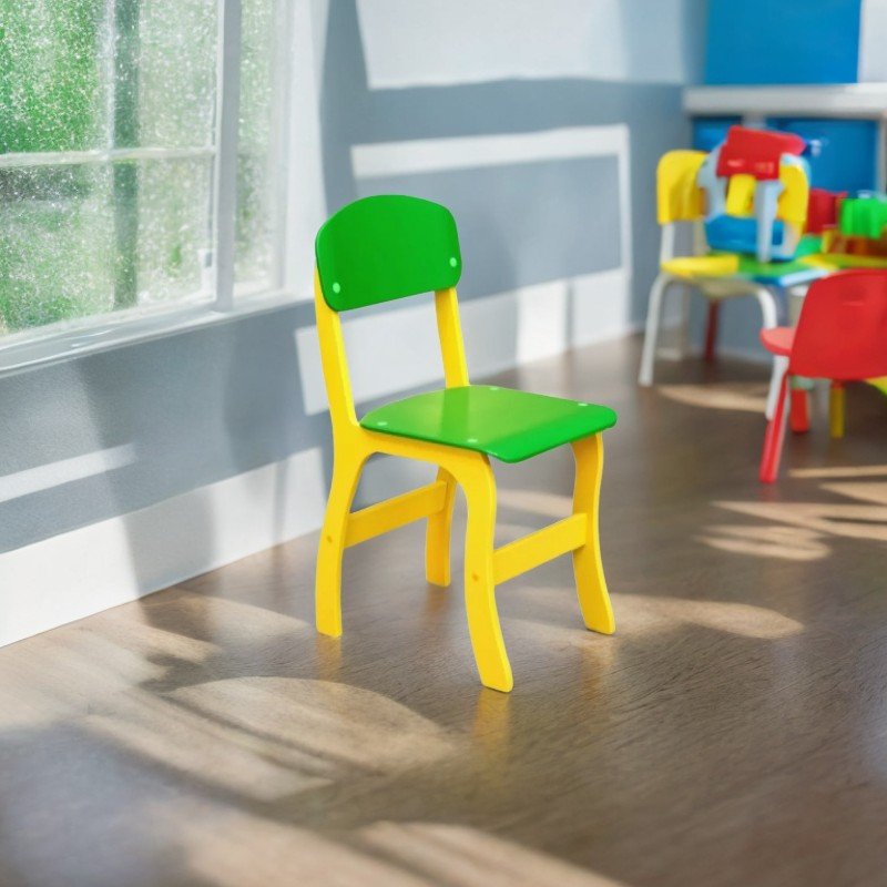 La sedia ha schienale e seduta in multistrato leggermente curvato, verniciato con vernice acrilica atossica all'acqua, spessore 8 mm. Le gambe sono in multistrato lucidato da 15 mm e tutti gli elementi sono fissati con ferramenta nascosta, garantendo la massima sicurezza.