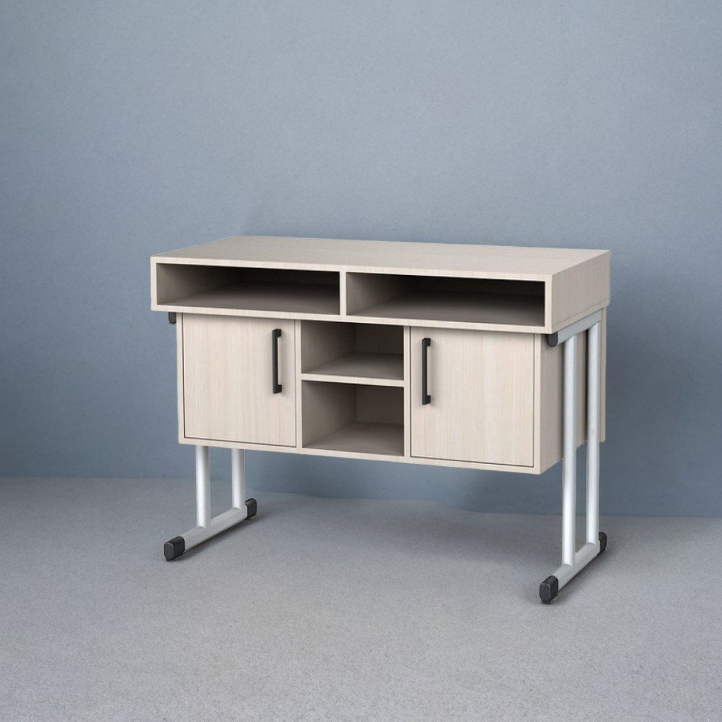 Dimensioni generali: 1200х600х900 mm; Peso: 36,96 kg; Il tavolo è realizzato in truciolare melaminico con uno spessore di 18 mm; Il tavolo da laboratorio è dotato di un ripiano e due cassetti; Il corpo ha un ripiano aperto regolabile e due ripiani interni regolabili; I telai metallici sono collegati dal piano del tavolo e dallo schermo; Il piano del tavolo è bordato con ABS da 1,0 mm, gli altri elementi con ABS da 0,5 mm; La struttura metallica è realizzata con tubi profilati da 50x30x1,2 mm, 30x15x1,2 mm e 38x20x1,2 mm, con strato decorativo protettivo; Le estremità del telaio sono dotate di tappi in plastica per la protezione; Colori del truciolare: faggio, rovere chiaro, grigio; Colore del telaio: verde (RAL6018), grigio (RAL7035).