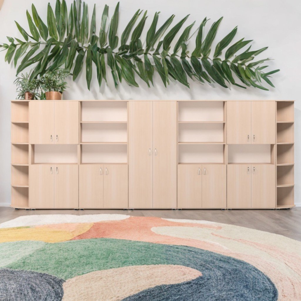 Dimensioni (L×P×A): 4870×430×1816 mm. Set di mobili realizzato in truciolare melaminico da 18 mm. La facciata è rifinita con bordo in ABS da 1 mm e le parti interne con bordo in ABS da 0,5 mm. La parete posteriore è realizzata in melaminico PFL bianco, spessore 3 mm. Il set è composto da 7 scomparti: (1) Mobile angolare con 5 ripiani arrotondati; (2) Libreria a 4 ante – include 4 ripiani chiusi e una nicchia centrale aperta; (3) Mobile biblioteca con 3 nicchie aperte e 2 ripiani chiusi; (4) Armadio – dotato di un ripiano e di una barra appendiabiti ovale in metallo a scomparsa (lunghezza 350 mm); (5) Mobile biblioteca identico al vano 3; (6) Libreria a 4 ante – 4 ripiani chiusi e una nicchia aperta; (7) Mobile angolare identico al vano 1. Le parti sono assemblate con elementi di fissaggio sicuri e sono destinate al montaggio a parete. I mobili sono dotati di gambe in plastica. Colori disponibili: perla artigianale, rovere chiaro.