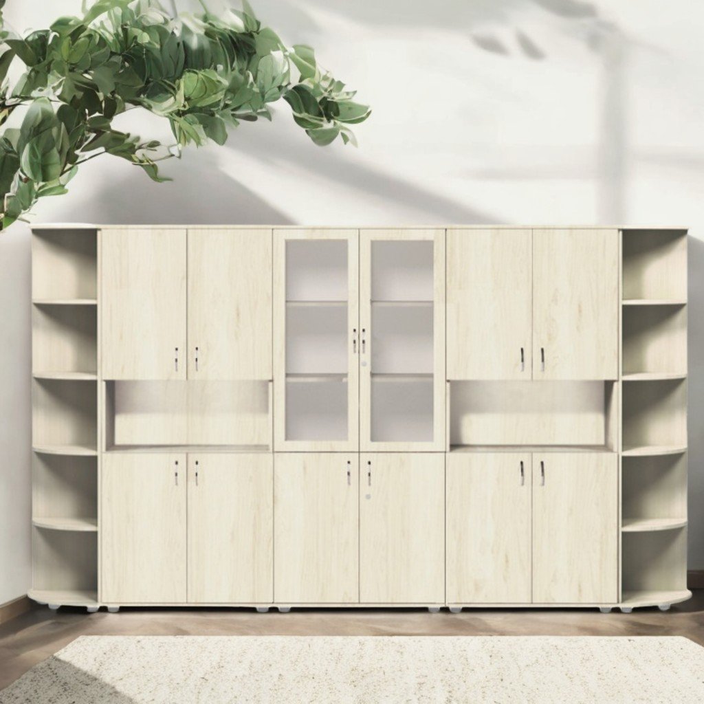 Set di mobili, 3266x430x1816 mm. Truciolare melaminico 18 mm, bordo ABS (anteriore 1 mm, interno 0,5 mm), retro in PFL bianco 3 mm. 5 scomparti: 2 mobili angolari con 5 ripiani arrotondati, 2 librerie con 4 ripiani chiusi e una nicchia, 1 vetrina (3 ripiani in vetro, 2 chiusi). Fissaggio sicuro, piedini in plastica. Colore: perla artigianale, rovere chiaro.