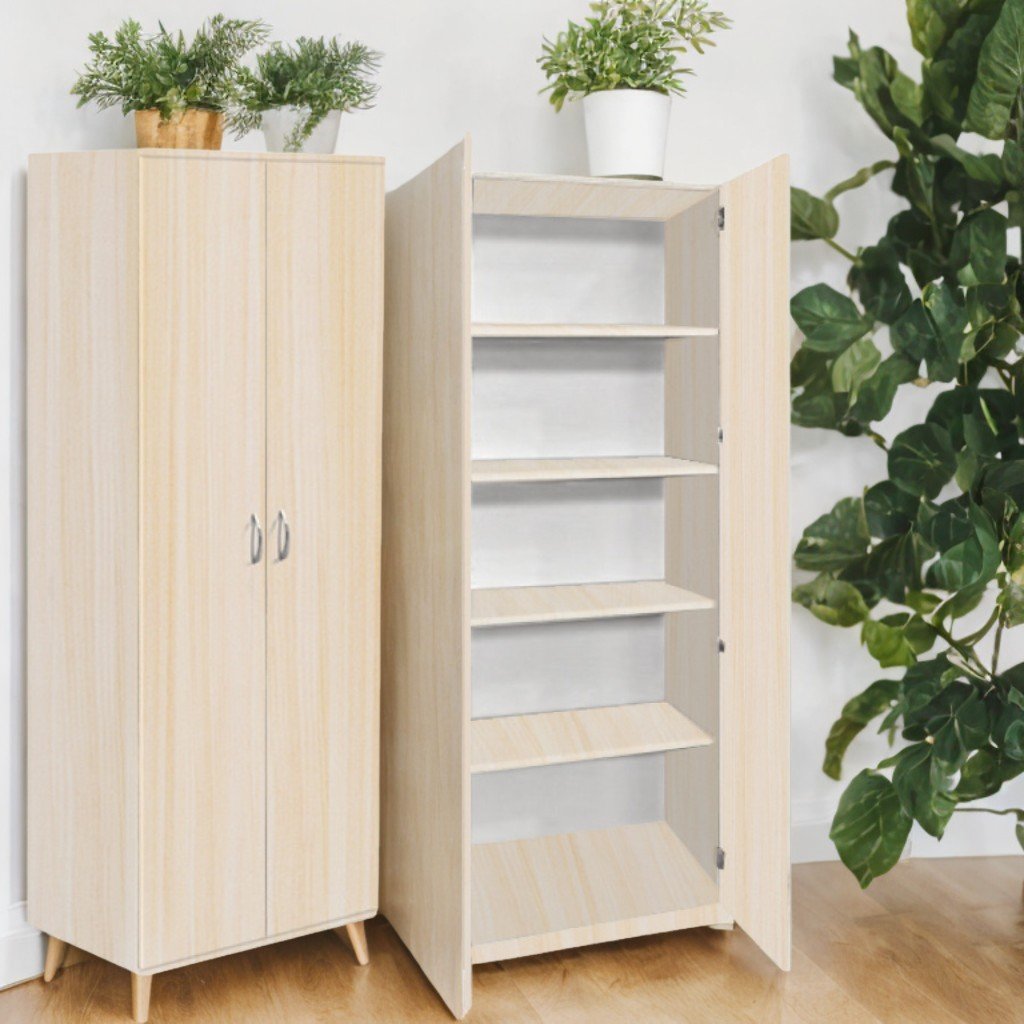 Dimensioni (L×P×A): 802×403×1816 mm. Peso: 57,28 kg. Il mobile è realizzato in truciolare melaminico con spessore di 18 mm. La facciata è rifinita con bordo in ABS da 1 mm e le parti interne sono dotate di bordo in ABS da 0,5 mm. La parete posteriore è realizzata in melaminico PFL bianco, spessore 3 mm. La configurazione include 5 ripiani chiusi, con possibilità di regolazione della distanza tra loro. Il mobile è dotato di maniglie cromate e piedini regolabili in plastica. Le parti sono assemblate con elementi di fissaggio speciali e sicuri. Colori disponibili: faggio, rovere chiaro.