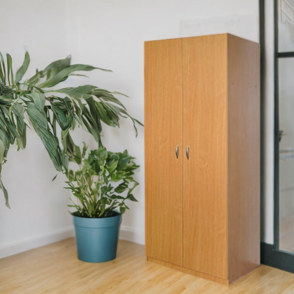 Dimensioni (L×P×A): 802×519×1816 mm. Peso: 73,50 kg. Il mobile è realizzato in truciolare melaminico con uno spessore di 18 mm. La facciata è rifinita con bordo in ABS da 1 mm e le parti interne sono dotate di bordo in ABS da 0,5 mm. La parete posteriore è realizzata in melaminico PFL bianco, con uno spessore di 3 mm. L'armadio è composto da due vani con due ante ciascuno: il primo vano ha un ripiano e una barra appendiabiti ovale cromata, e il secondo vano aperto contiene 5 ripiani. La distanza tra i ripiani è regolabile. Il mobile è dotato di maniglie cromate e piedini regolabili in plastica. I componenti sono assemblati con elementi di fissaggio speciali e sicuri. Colori disponibili: faggio, rovere chiaro.
