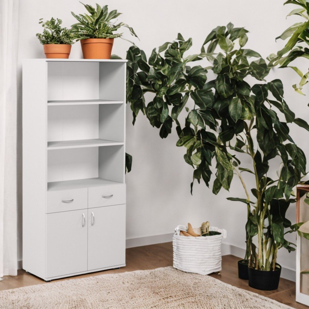 Mobile - dimensioni: 802×403×1816 mm, peso: 55,42 kg. Truciolare melaminico 18 mm, retro in PFL bianco 3 mm. Frontale con bordo ABS 1 mm, interno 0,5 mm. 3 nicchie aperte nella parte superiore, 2 cassetti e 2 ripiani chiusi nella parte inferiore. Mine cromate, ripiani fissi. Piedini regolabili in plastica. Colori: faggio, rovere chiaro. Montaggio sicuro.