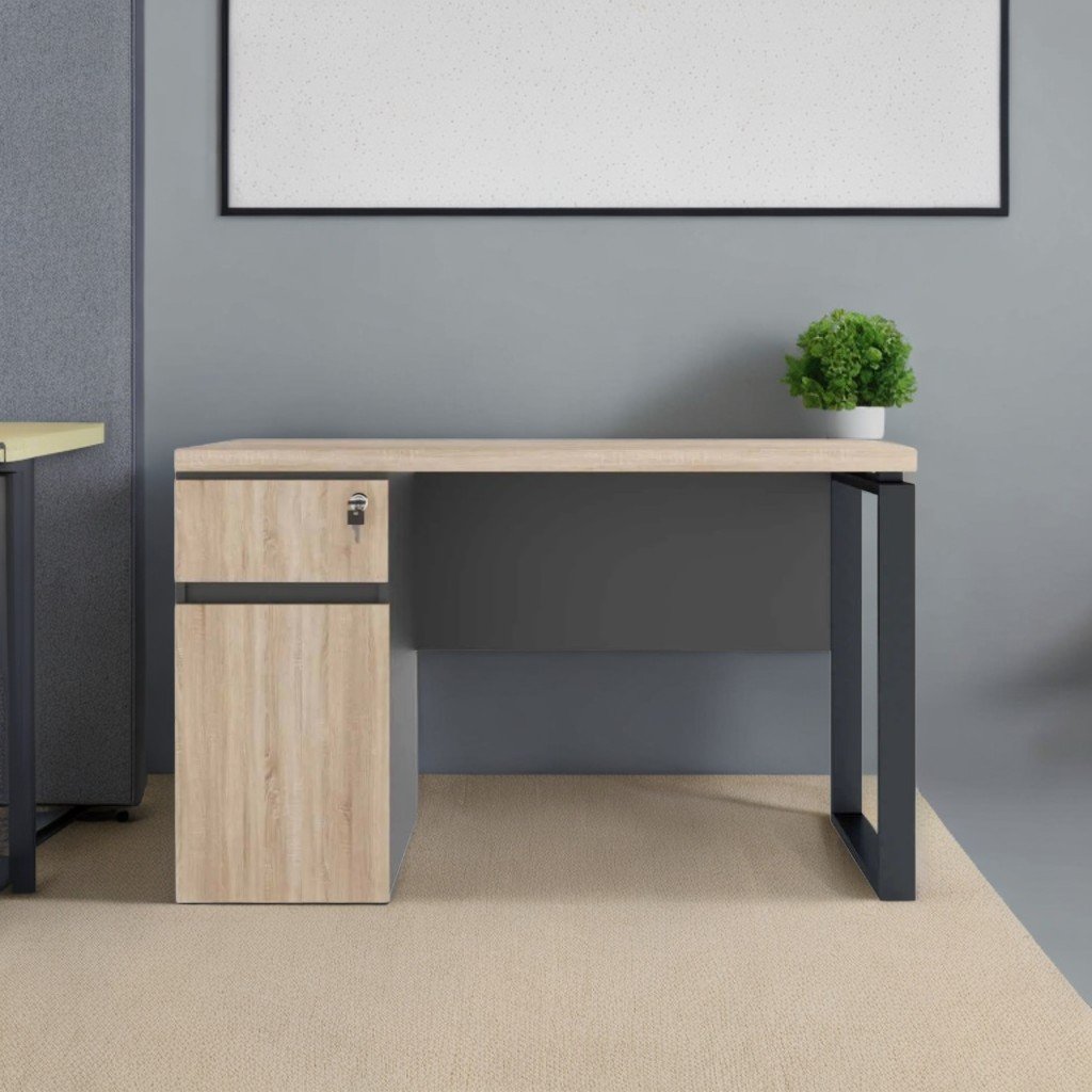 La struttura in truciolare da 18 mm assicura robustezza e affidabilità nel tempo, mentre la bordatura ABS da 1/0,5 mm protegge le superfici dall’usura quotidiana. Il mobile laterale con cassetto destro offre spazio immediato per documenti, accessori e materiali di lavoro, mantenendo l’area operativa sempre ordinata.