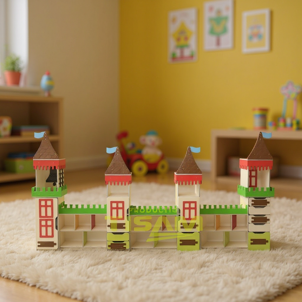 Il design si ispira all'architettura medievale, con i mobili decorati con applicazioni in MDF colorato che riproducono elementi specifici di un castello. La forma dei mobili, con sagome di torri, contribuisce a creare un'atmosfera fiabesca, ideale per gli spazi dedicati ai bambini.