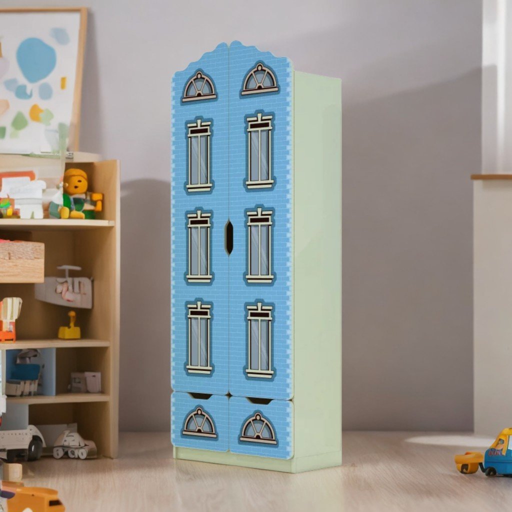 Mobile a due ante, realizzato in truciolare melaminico da 16 mm, con parete posteriore in melaminico PFL bianco da 3 mm. La facciata è rifinita con bordi in ABS da 1 mm e i componenti interni con bordi da 0,5 mm. L'interno è suddiviso in due scomparti: uno con ganci appendiabiti, l'altro con ripiani. Le ante hanno angoli arrotondati e sono decorate con stampa fotografica che riproduce la facciata di un edificio con finestre, porte e tetto, protetta con vernice acrilica a base d'acqua, atossica, resistente ai graffi e alla pulizia a umido. Il mobile è dotato di guarnizioni in plastica resistenti, chiusure di sicurezza e sistema di fissaggio a parete per la sicurezza dei bambini.