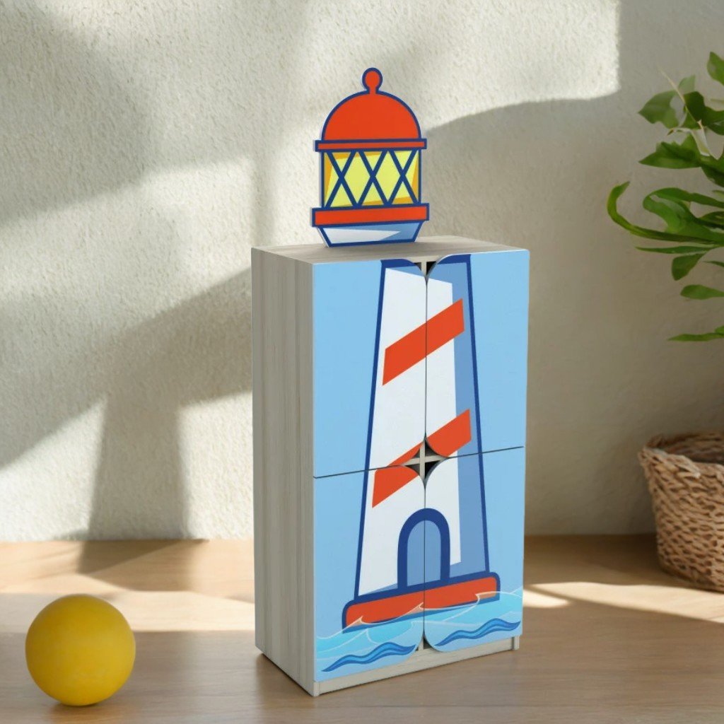 Nella parte superiore, è presente un elemento decorativo a forma di faro, realizzato in MDF beige, decorato con stampa fotografica. Il mobile è assemblato con elementi di sicurezza e il corpo è rifinito in faggio artigianale color perla, che conferisce un aspetto elegante e resistente.