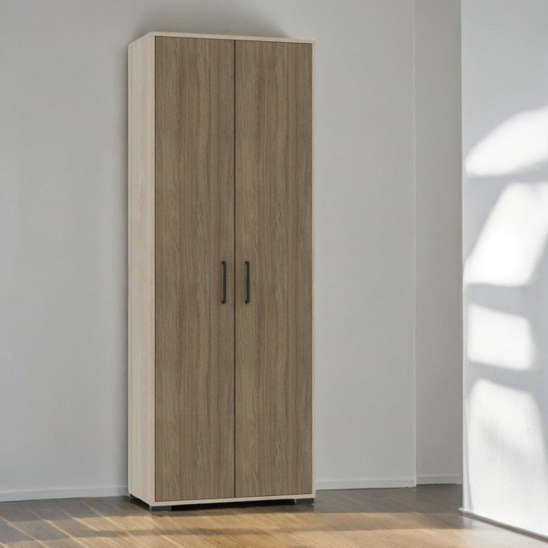 Dimensioni: 580 x 405 x 2025 mm (L x P x A) Realizzato in truciolare laminato da 18 mm, questo mobile offre un perfetto equilibrio tra resistenza ed estetica. La parte anteriore è protetta da un bordo in ABS da 1 mm e i componenti interni sono rifiniti con un bordo da 0,5 mm per un aspetto ordinato e una maggiore durata. Il retro è realizzato in melaminico PFL bianco da 3 mm di spessore, che offre stabilità e una finitura pulita. L'allestimento interno include 3 ampi ripiani e una barra appendiabiti retrattile, perfetta per organizzare vestiti e altri oggetti personali. I componenti sono assemblati con elementi di fissaggio sicuri e sono pronti per il montaggio a parete. La base è dotata di piedini in plastica che proteggono il mobile e il pavimento. La finitura combina due tonalità moderne e versatili: perla artigianale e rovere marrone urbano.