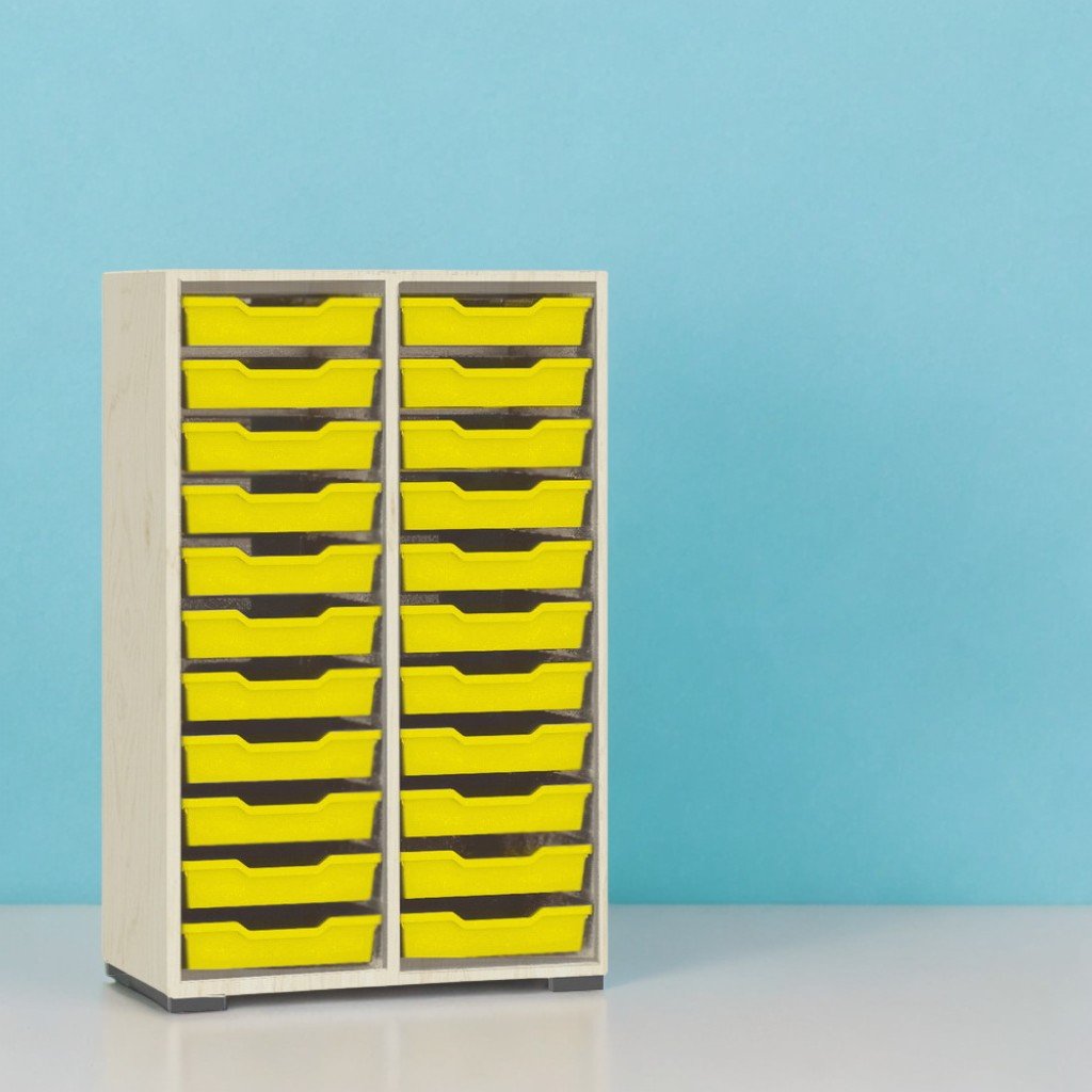 Dimensioni (L×P×A): 703×405×1087 mm. Peso: 35,98 kg. Mobile realizzato in truciolare melaminico da 18 mm. La parete posteriore è in melaminico PFL bianco, spessore 3 mm. La facciata è bordata con ABS da 1 mm. Composizione: 22 contenitori in plastica Gratnells N1, gialli e marroni. Le parti sono assemblate con elementi di fissaggio speciali e sicuri. Il mobile è dotato di guarnizioni in plastica resistenti. Colore del contenitore: perla artigianale, rovere urbano marrone. Colore dei contenitori: giallo, marrone.