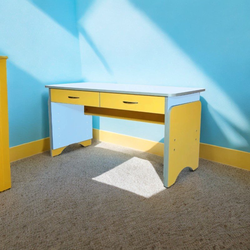 Pratico tavolo per 2 bambini, con piano in truciolare melaminico da 16 mm, angoli arrotondati e bordo in ABS argentato. Include un cassetto singolo con maniglia cromata per ogni bambino. L'altezza è regolabile in 4 posizioni: 500, 560, 620 e 680 mm. Le gambe sono dotate di guarnizioni in plastica resistente per stabilità e protezione. Dimensioni: 1100 x 500 mm | Peso: 28,1 kg | Garanzia: 24 mesi Colori disponibili: giallo/verde limone, giallo/blu, faggio