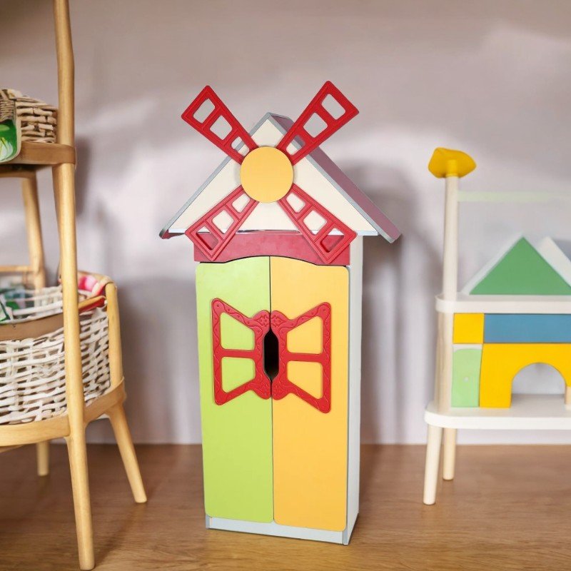 Il mobile è dotato di 4 ampi ripiani e ante con angoli arrotondati, dotate di speciali fori per una facile apertura. Le ante sono decorate con applicazioni in MDF colorato, che rappresentano elementi di ispirazione rustica, tipici di un mulino.