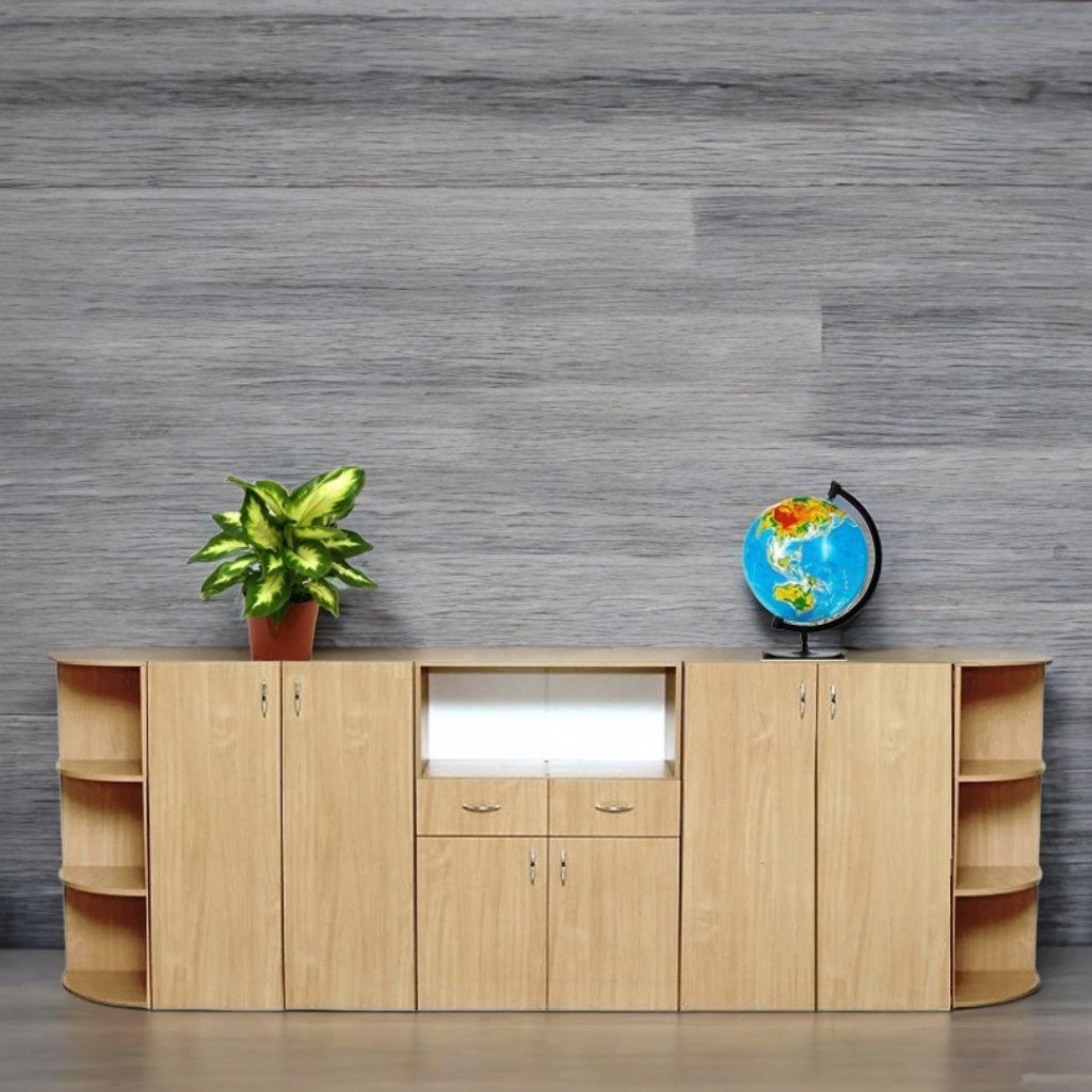Dimensioni (L×P×A): 3200×400×1100 mm. Set di mobili realizzato in truciolare melaminico da 18 mm. Le facciate sono rifinite con bordi in ABS da 1 mm e le parti interne con bordi da 0,5 mm. Il retro è in melaminico PFL bianco, spessore 3 mm. Il set è composto da 5 scomparti: gli scomparti 1 e 5 sono angolari con 3 ripiani ciascuno con angoli arrotondati; gli scomparti 2 e 4 includono 3 ripiani chiusi ciascuno; lo scomparto 3 include una nicchia, 2 cassetti e 2 ripiani chiusi. Il set è dotato di maniglie cromate, piedini regolabili in plastica ed è assemblato con speciali e sicuri fissaggi. I mobili sono fissati tra loro con tasselli in legno. Colori disponibili: faggio, rovere chiaro.