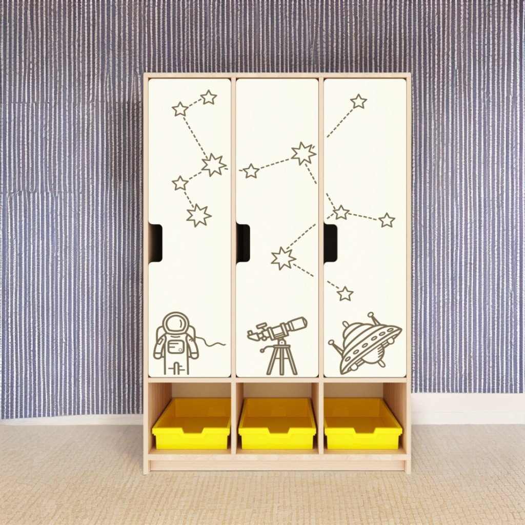 Il mobile è dotato di tre ante con angoli arrotondati, ciascuna con uno spazio ergonomico per l'apertura. Le ante sono decorate con una stampa fotografica originale - una stella, un telescopio e un astronauta - protetta da una vernice acrilica a base d'acqua e atossica che offre una maggiore resistenza ai graffi e consente una facile pulizia.