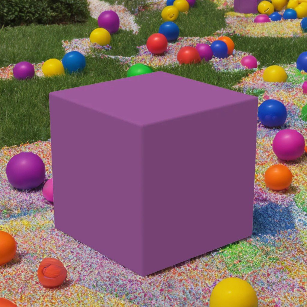 Il cubo è leggero, morbido ma stabile, realizzato in schiuma con una densità di 22 kg/m³, adatto anche ai più piccoli. È rivestito in ecopelle di alta qualità – un materiale opaco, morbido e resistente all'usura, privo di ftalati o metalli pesanti – o in tessuto PVC denso da 630 g/m², lucido, sicuro e di facile manutenzione.