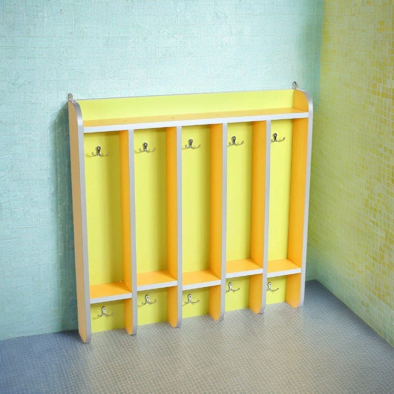 Modello realizzato in truciolare melaminico da 16 mm, con facciata rifinita con bordo in ABS argento da 1 mm. L'appendiabiti è dotato di 5 scomparti, ciascuno dotato di 2 ganci cromati (superiore e inferiore) e di un ripiano separatore alla base. Sopra, un ripiano aggiuntivo offre spazio di stivaggio. Il design con angoli arrotondati e fissaggio sicuro alla parete è ideale per l'uso in asili nido o spazi educativi. La struttura è stabile e resistente con elementi di fissaggio resistenti. Dimensioni: 750 x 120 x 750 mm Peso: 10,9 kg Colori: Giallo/Verde Lime, Giallo/Blu, Faggio, Rovere Chiaro Garanzia: 24 mesi
