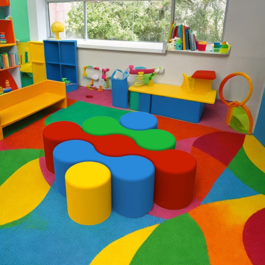 Il set "Zig-Zag" include 5 cuscini multicolori, ideali per giochi di gruppo in asili nido, scuole materne, sale giochi e centri commerciali.