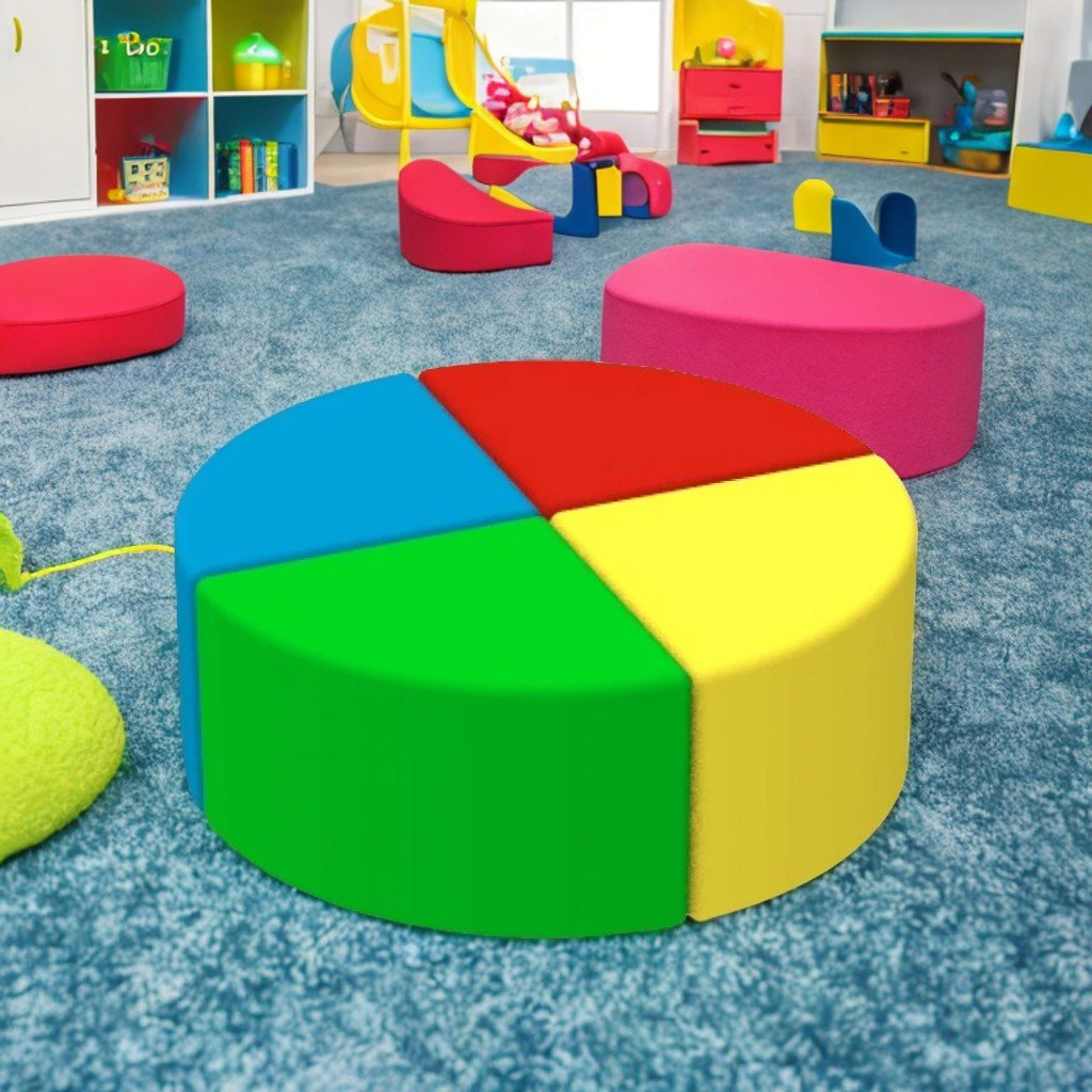 Set di cuscini "Cilindro" con 4 elementi multicolore, adatti al gioco attivo e allo sviluppo della manualità dei bambini. Leggeri per una facile movimentazione, senza spigoli vivi per la sicurezza. Resistenti, ipoallergenici, non assorbono odori né umidità, non scoloriscono e sono facili da pulire. Densità della gommapiuma 22 kg/m³. Materiale PVC/ecopelle. Dimensioni 90×90×35 cm, volume 0,1 m³. Colori disponibili: bianco-giallo-verde-viola, giallo-rosso-blu-verde, rosa-giallo, verde-giallo. Consigliato per interni; esterno solo con tempo asciutto. Pulire con normali detergenti, senza cloro o solventi.