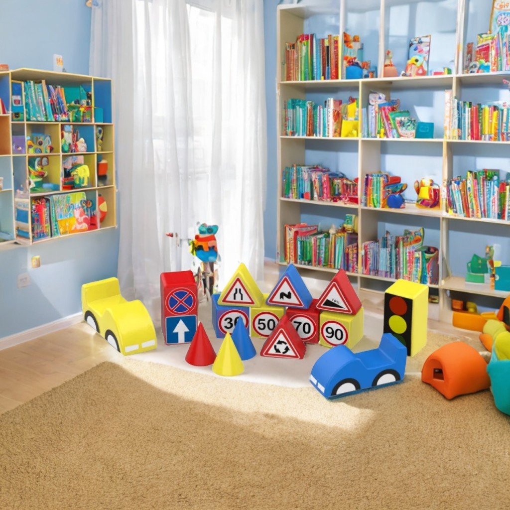 Il set di moduli softplay "Scoala Auto" aiuta i bambini ad apprendere le regole di base del comportamento nel traffico.