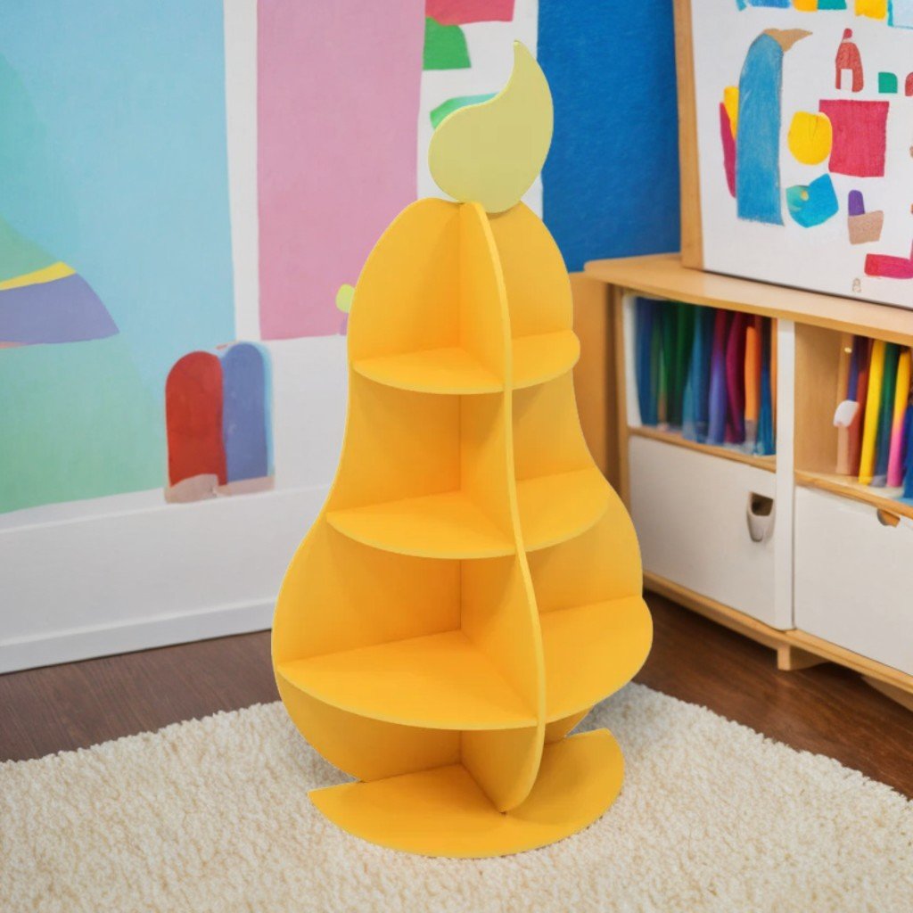 Dimensioni (L x P x A): 1050 x 525 x 2000 mm. La mensola ha la forma di una pera, con un design distintivo e allegro. È realizzata in truciolare melaminico da 16 mm di spessore, mentre l'applicazione a forma di foglia è realizzata in MDF da 16 mm. La mensola ha 6 ripiani aperti, offrendo ampio spazio di archiviazione. È dotata di sistemi di fissaggio in metallo, che consentono un fissaggio sicuro alla parete. Il colore dei ripiani è giallo e la foglia è una vivace tonalità di lime. Periodo di garanzia: 24 mesi.