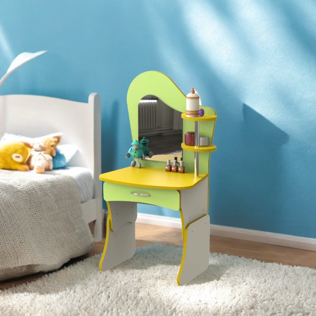 Realizzato in truciolare melaminico da 16 mm con bordi rifiniti con nastro in PVC da 0,5 e 1 mm per garantire resistenza e un aspetto gradevole. Sul lato destro, il mobile offre due ripiani aperti dotati di barra cromata rotonda e un ampio cassetto nella parte inferiore. Gli angoli e le superfici dei ripiani sono arrotondati per una maggiore sicurezza.