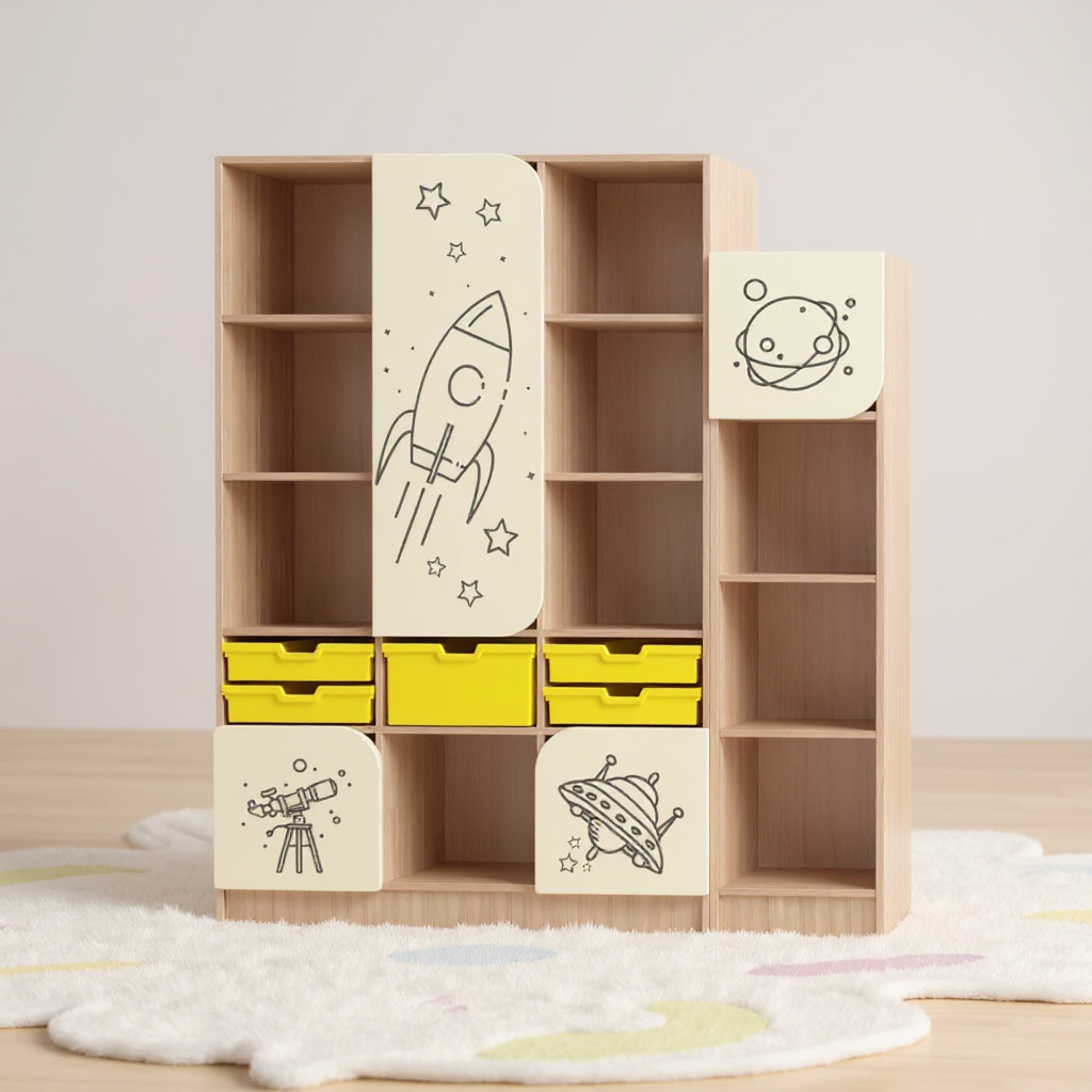 Il set di mobili ha dimensioni totali di 1392 x 400 x 1600 mm ed è realizzato in truciolare laminato con uno spessore di 16 mm. La parete posteriore è in melaminico PFL bianco, con uno spessore di 3 mm. La parte anteriore del mobile è placcata con bordi in ABS da 1 mm e le parti interne beneficiano di bordi da 0,5 mm. I mobili sono dotati di ante con angoli arrotondati, dotate di uno speciale spazio per l'apertura, garantendo così un design sicuro e funzionale. Il set è composto da due mobili che includono sia ripiani aperti che chiusi. Per ulteriore spazio di stoccaggio, il set è completato da cassette in plastica nelle dimensioni 312x377x75 mm (quattro pezzi) e 312x377x150 mm (un pezzo), fissate con guide in plastica per una facile movimentazione. Le ante del mobile sono decorate con una stampa fotografica a tema spaziale – razzi, stelle, luna, telescopio, astronauta e satellite – rivestita con una vernice acrilica atossica a base d'acqua che offre una maggiore resistenza all'usura e consente la pulizia a umido. Tutti gli elementi del set sono collegati tramite speciali fissaggi sicuri e nascosti, e il mobile può essere fissato alla parete per una maggiore stabilità. Il colore del rivestimento è rovere chiaro e la facciata è in tonalità beige. Il prodotto è coperto da una garanzia di 24 mesi.