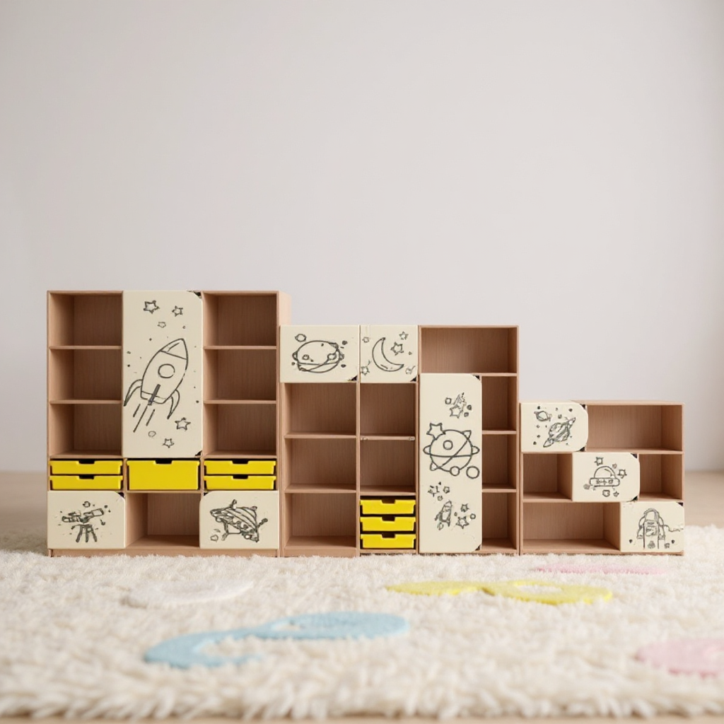Il set ha dimensioni di 3296 × 400 × 1600 mm ed è realizzato in truciolare laminato da 16 mm di spessore, mentre la parete posteriore è in melaminico PFL bianco da 3 mm. Le facciate sono rifinite con bordi in ABS da 1 mm e l'interno con bordi in ABS da 0,5 mm. Composto da 5 mobili con ripiani aperti e chiusi, il set include anche contenitori in plastica montati su guide: 7 pezzi da 312 × 377 × 75 mm, 1 pezzo da 312 × 377 × 150 mm e 1 pezzo da 525 × 470 × 43 mm. Le ante dei mobili sono arrotondate, dotate di rientranze per l'apertura e decorate con stampe fotografiche a tema (razzi, stelle, luna, telescopio, astronauta, satellite), protette con vernice acrilica atossica a base d'acqua. Tutti gli elementi sono assemblati con ferramenta sicura e nascosta e sono progettati per il montaggio a parete. Il rivestimento è in rovere chiaro e le facciate sono beige. Garanzia: 24 mesi.