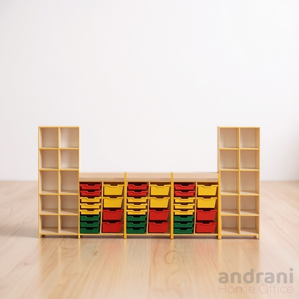Set di mobili realizzato in truciolare laminato da 16 mm, con parete posteriore in melaminico PFL bianco da 3 mm. Le facciate sono rifinite con bordo in ABS giallo da 1 mm e l'interno con bordo da 0,5 mm. I componenti includono 5 scomparti: 1 e 5 con 10 nicchie ciascuno, e 2, 3 e 4 dotati di 12 contenitori in plastica colorata ciascuno (giallo, rosso, verde). Le ante hanno angoli arrotondati e apertura ergonomica. Il mobile è fissato al muro per la sicurezza dei bambini e dotato di guarnizioni in plastica resistenti. Colore del corpo: rovere chiaro e faggio.