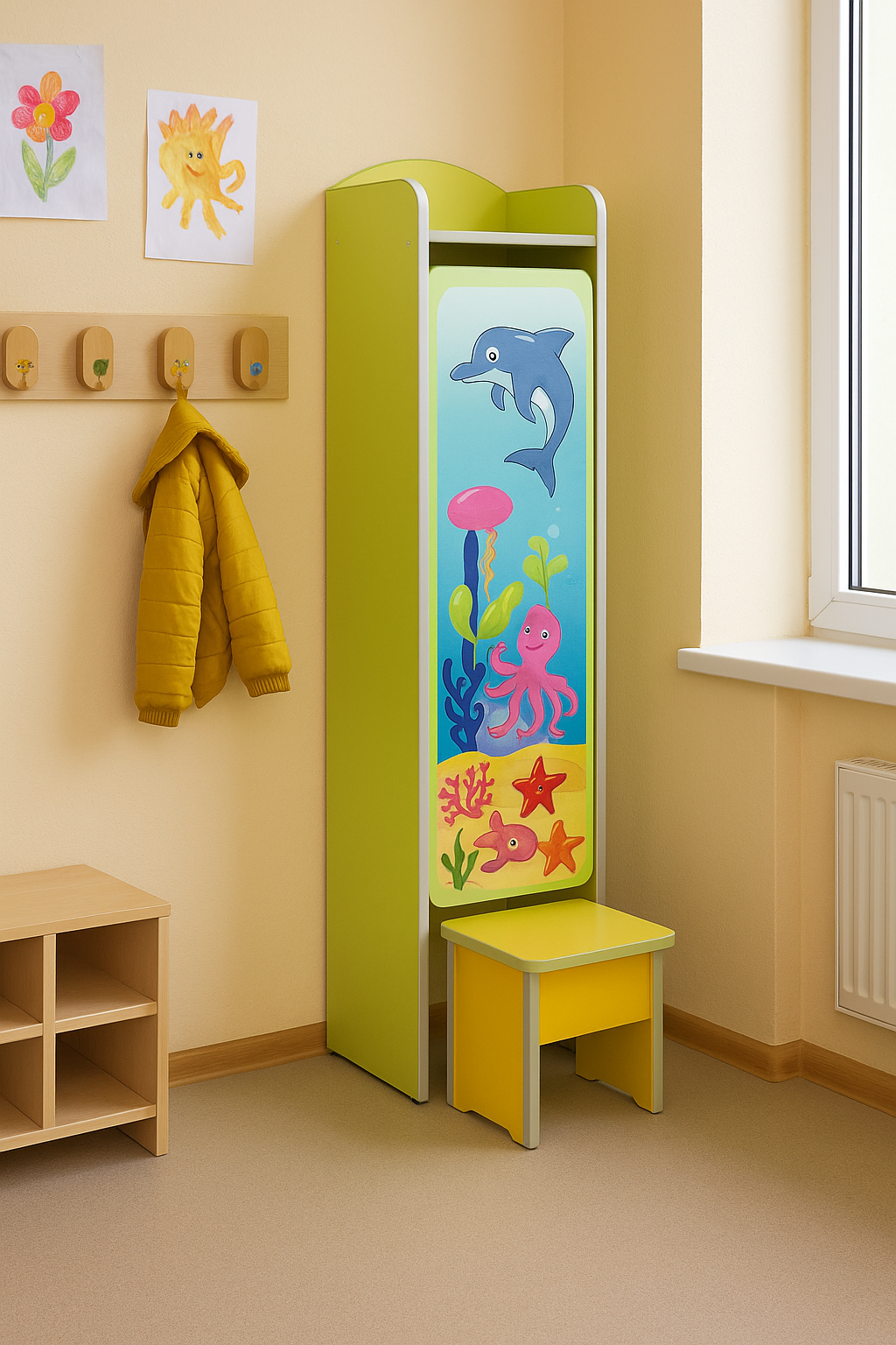 Il modello include un ripiano superiore, un ripiano interno, due ganci cromati e una panca estensibile con bordi arrotondati. L'anta è personalizzata con una stampa fotografica a tema - animali marini - resistente all'acqua.