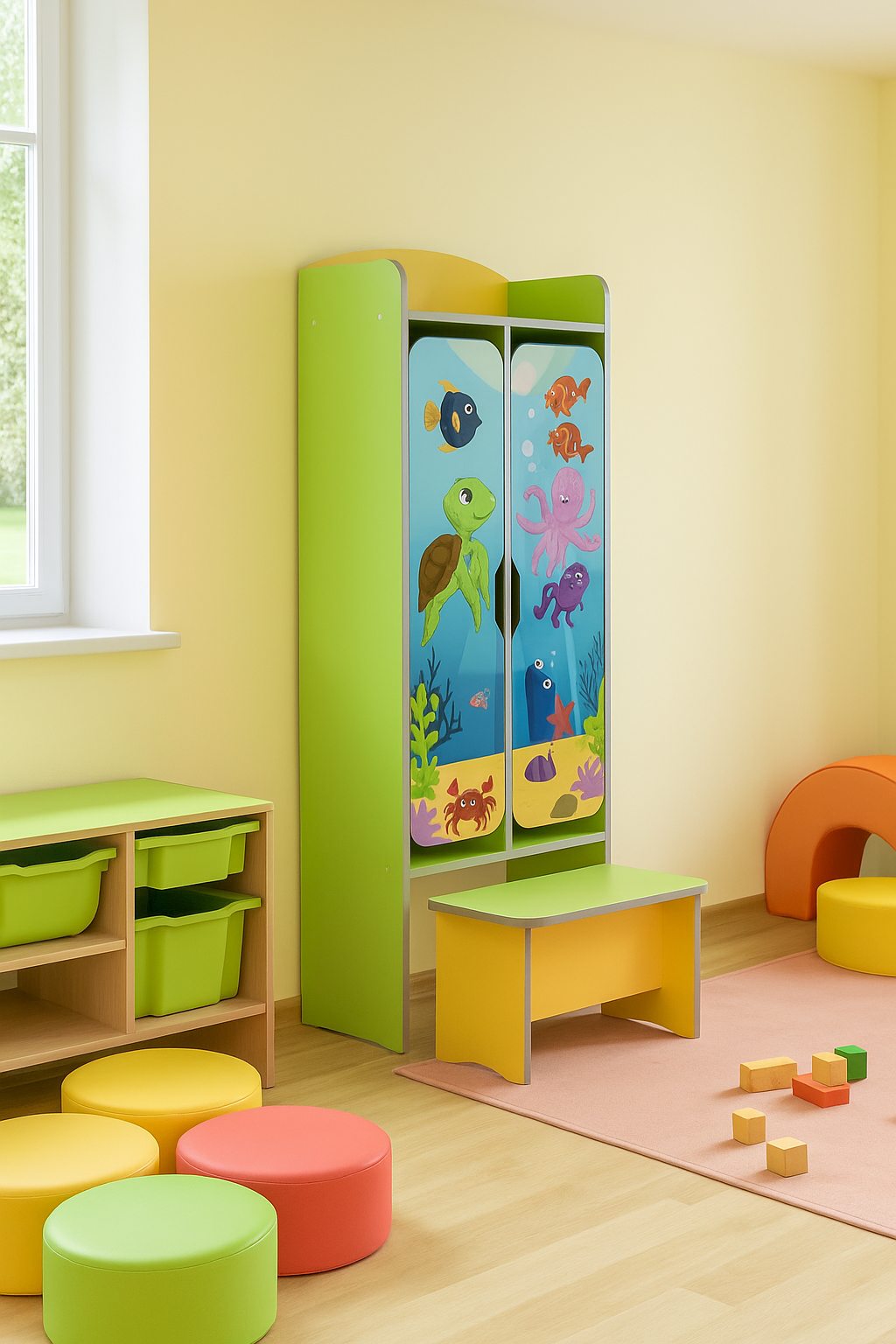 Lo spogliatoio con due scomparti e una panca estensibile è realizzato in truciolare melaminico da 16 mm, con parete posteriore in PFL da 3 mm. I frontali sono rifiniti con bordi in ABS da 1 mm e gli elementi interni con bordi da 0,5 mm, entrambi in argento. È dotato di 4 ante con angoli arrotondati, dotate di apertura ergonomica e stampa fotografica di animali marini resistente all'acqua. Ogni scomparto include due ripiani (superiore e inferiore) e due grucce cromate. La panca ha bordi arrotondati e si integra perfettamente nella struttura. Il mobile è fissato a parete per sicurezza ed è dotato di guarnizioni in plastica resistente. Colore struttura: verde lime/giallo; facciate colorate con stampa fotografica. Garanzia: 24 mesi.