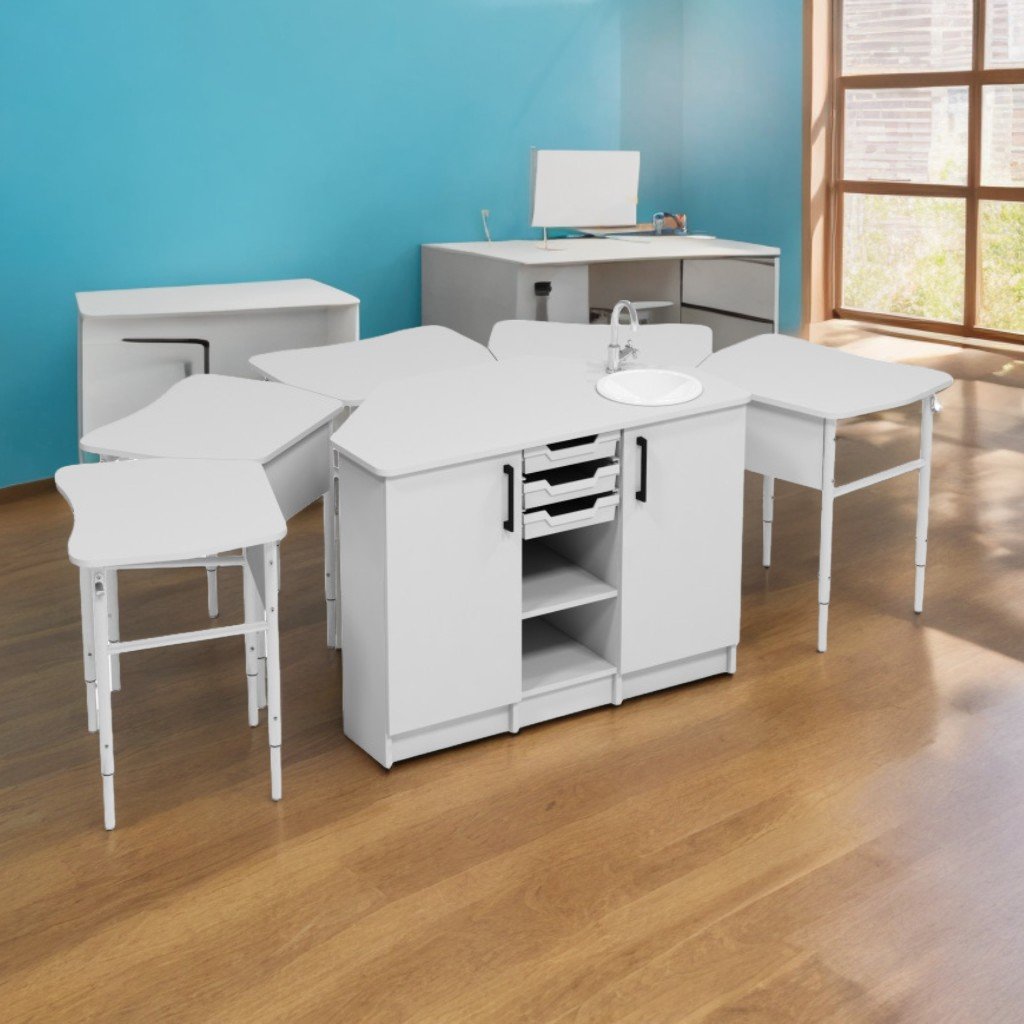 Tavolo dimostrativo con mobiletto - dimensioni: 1200x650x860 mm. La base è un mobiletto in truciolare laminato con bordi rivestiti con nastro in PVC da 1 mm. Il piano è poligonale con sei lati e angoli arrotondati per la sicurezza. Un lavello rotondo con rubinetto è integrato sul lato destro del piano di lavoro. Il mobiletto ha tre vani: due chiusi con ripiani (destro e sinistro) e uno centrale aperto con ripiano regolabile e 3 vassoi in plastica opzionali su guide. Colori del truciolare disponibili: faggio, rovere chiaro, grigio.