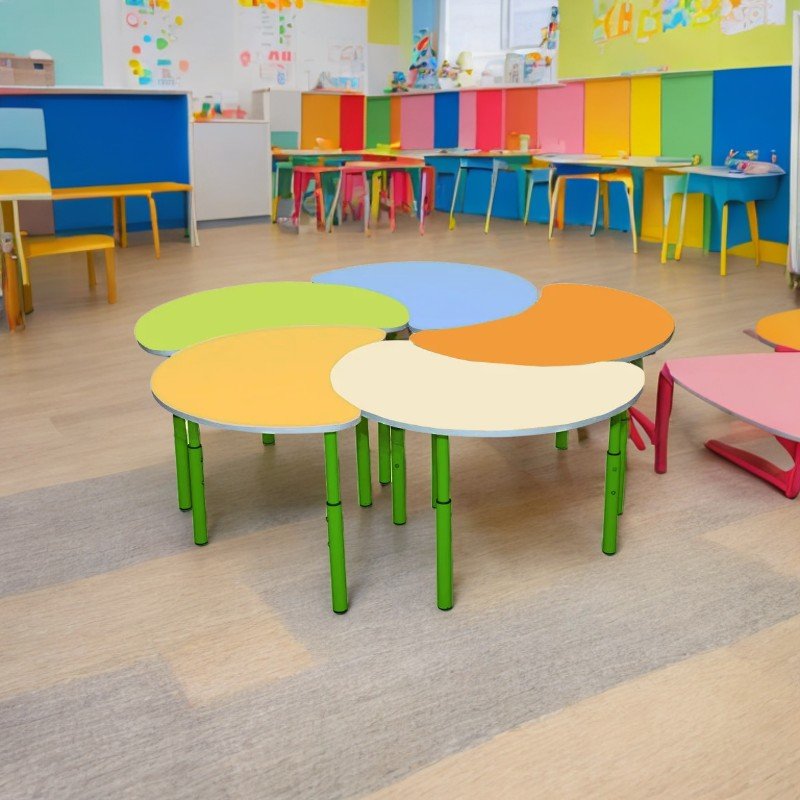 Set modulare composto da 5 tavoli da 700x500 mm ciascuno, per una superficie totale di 1350x1350 mm, progettato per 5 bambini, sia per attività di gruppo che individuali. Il piano è realizzato in truciolare melaminico colorato da 16 mm con angoli arrotondati e bordo in ABS argento da 1 mm per la sicurezza. La struttura metallica rotonda (Ø 25–32 mm) è regolabile telescopicamente per altezze di 460, 520 o 580 mm, con guarnizioni protettive in plastica. Le gambe sono verniciate elettrostaticamente, dotate di tappi in plastica e tutti i giunti sono fissati con viti a brugola e dadi a scomparsa.