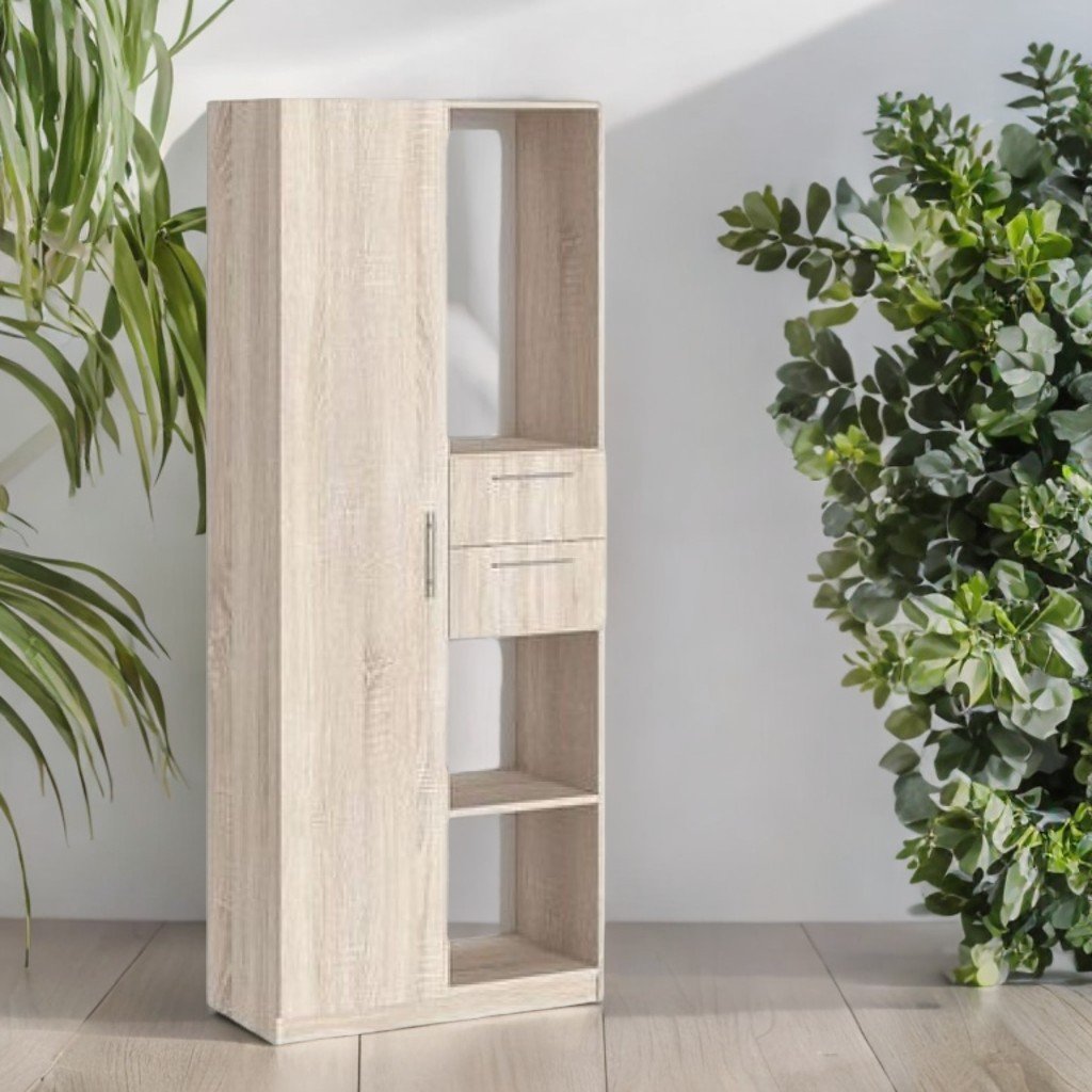 Dimensioni (L×P×A): 800×400×2000 mm. Mobile realizzato in truciolare melaminico con spessore 18 mm. La facciata è rifinita con bordo in ABS da 1 mm e le parti interne con bordo da 0,5 mm. Il retro è realizzato in melaminico PFL bianco, spessore 3 mm. Il mobile contiene 4 ripiani chiusi con ante e una nicchia aperta nella parte inferiore. È dotato di maniglie cromate e le parti sono assemblate con speciali e sicure chiusure. Colori disponibili: frassino bianco, rovere sonoma.