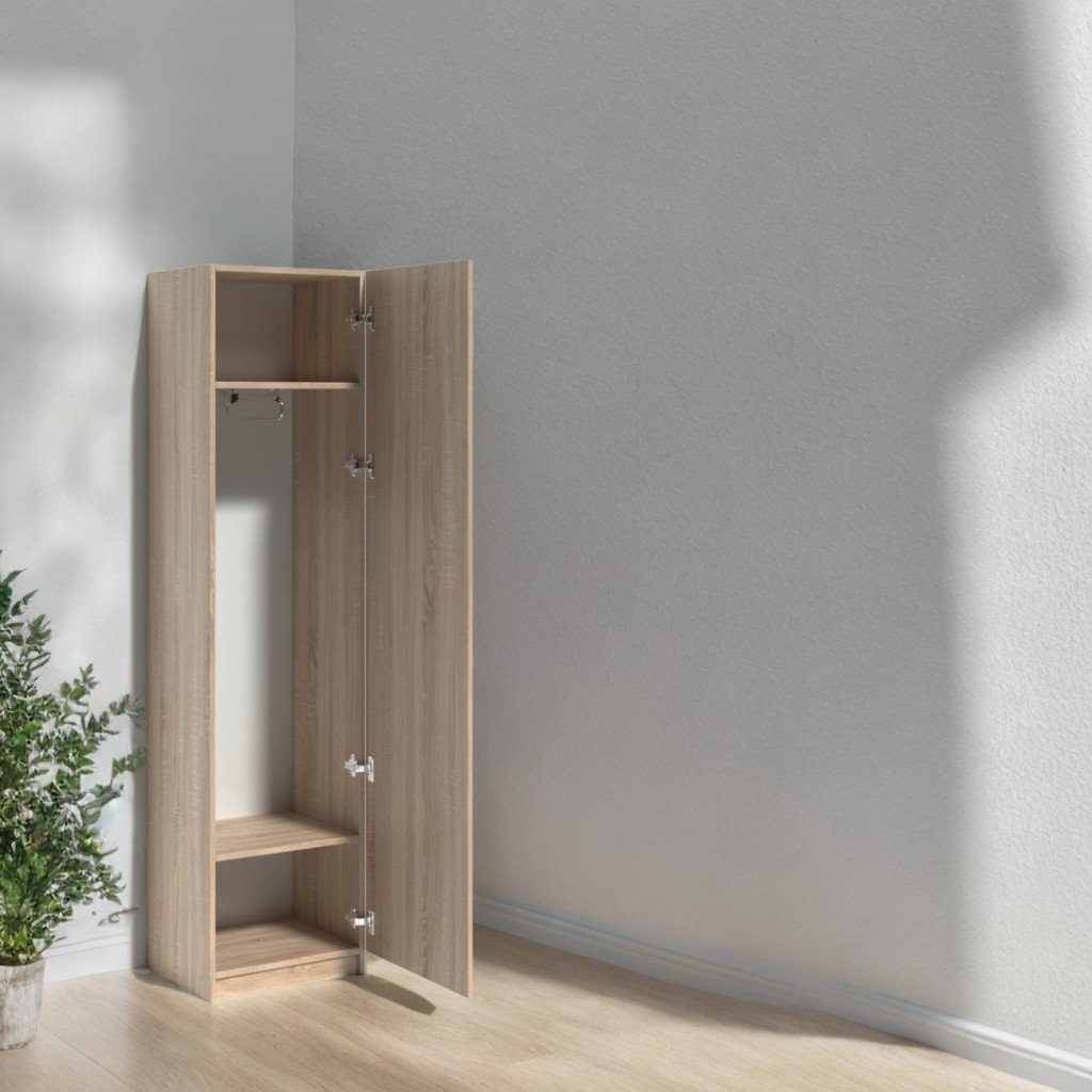 Armadio con appendiabiti - dimensioni: 400×500×2000 mm. Truciolare melaminico 18 mm, schienale in PFL bianco 3 mm. Facciata con ABS 1 mm, interno con ABS 0,5 mm. 1 ripiano e barra cromata per appendiabiti (22×15 mm). Maniglie cromate. Piedini regolabili in plastica. Colori: rovere sonoma, frassino bianco.