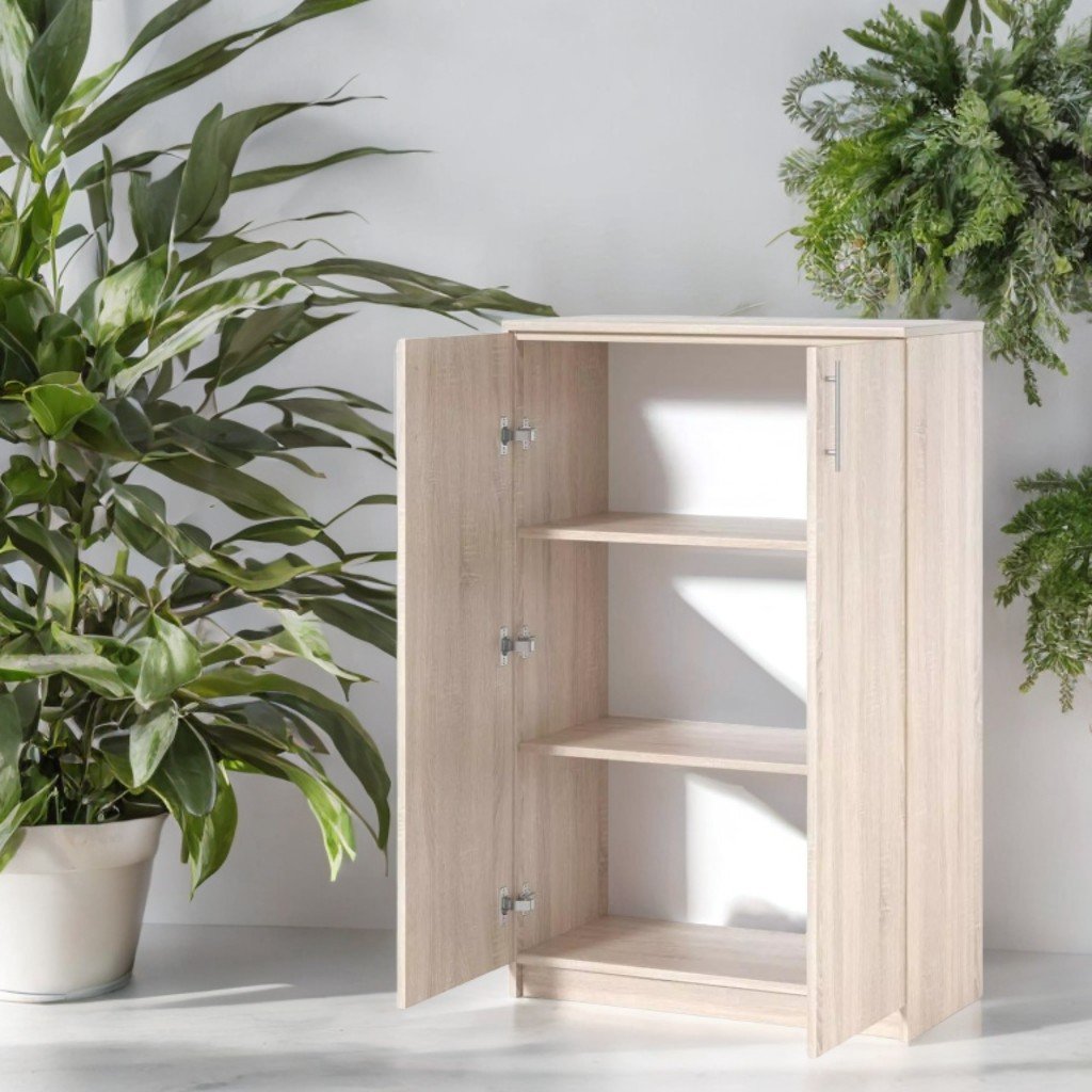 Mobiletto, 800x400x1260 mm. Truciolare melaminico 18 mm, bordo ABS (anteriore 1 mm, interno 0,5 mm), retro in PFL bianco 3 mm. 3 ripiani portaoggetti, maniglie cromate, assemblato con ferramenta di sicurezza. Colore: rovere Sonoma.