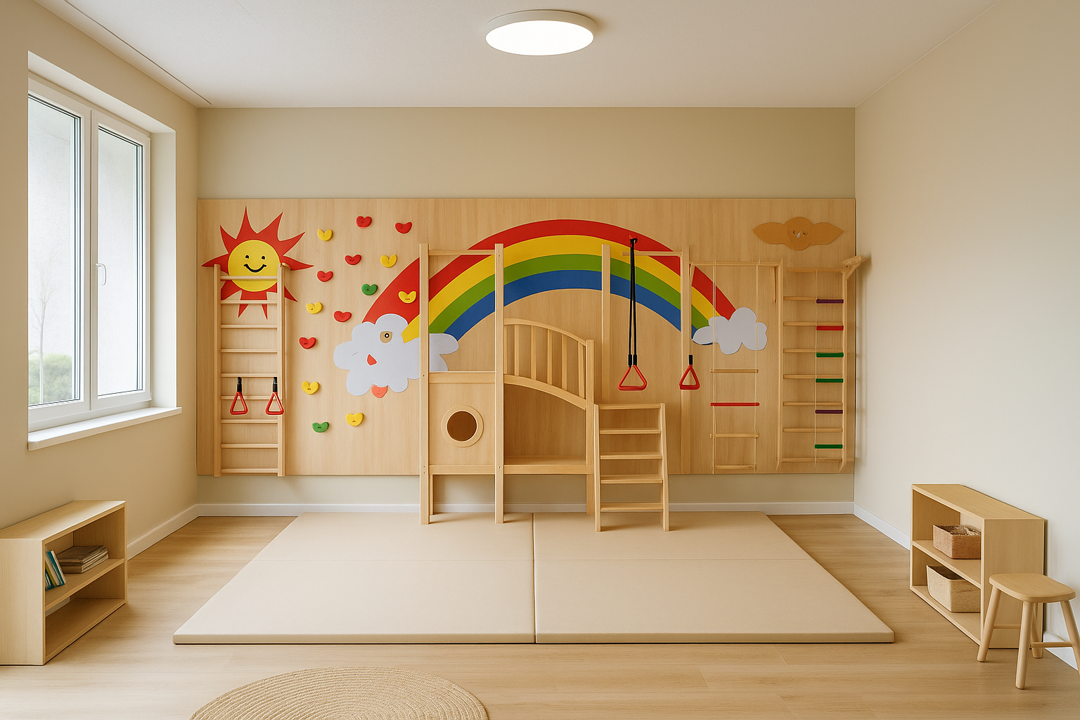 L'intero complesso è decorato con vivaci immagini di arcobaleni, sole e uccelli, per creare un ambiente attraente e divertente per i bambini.