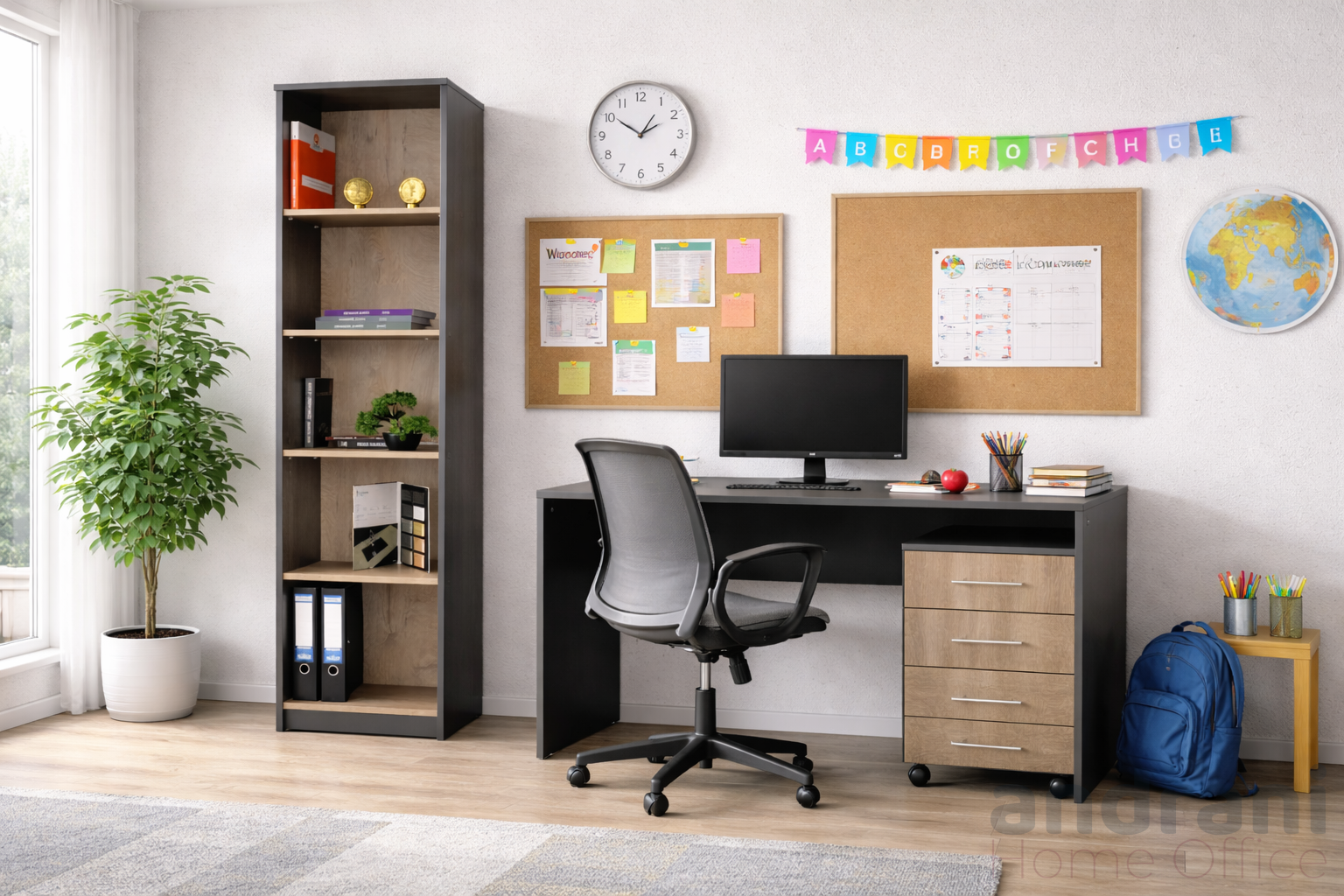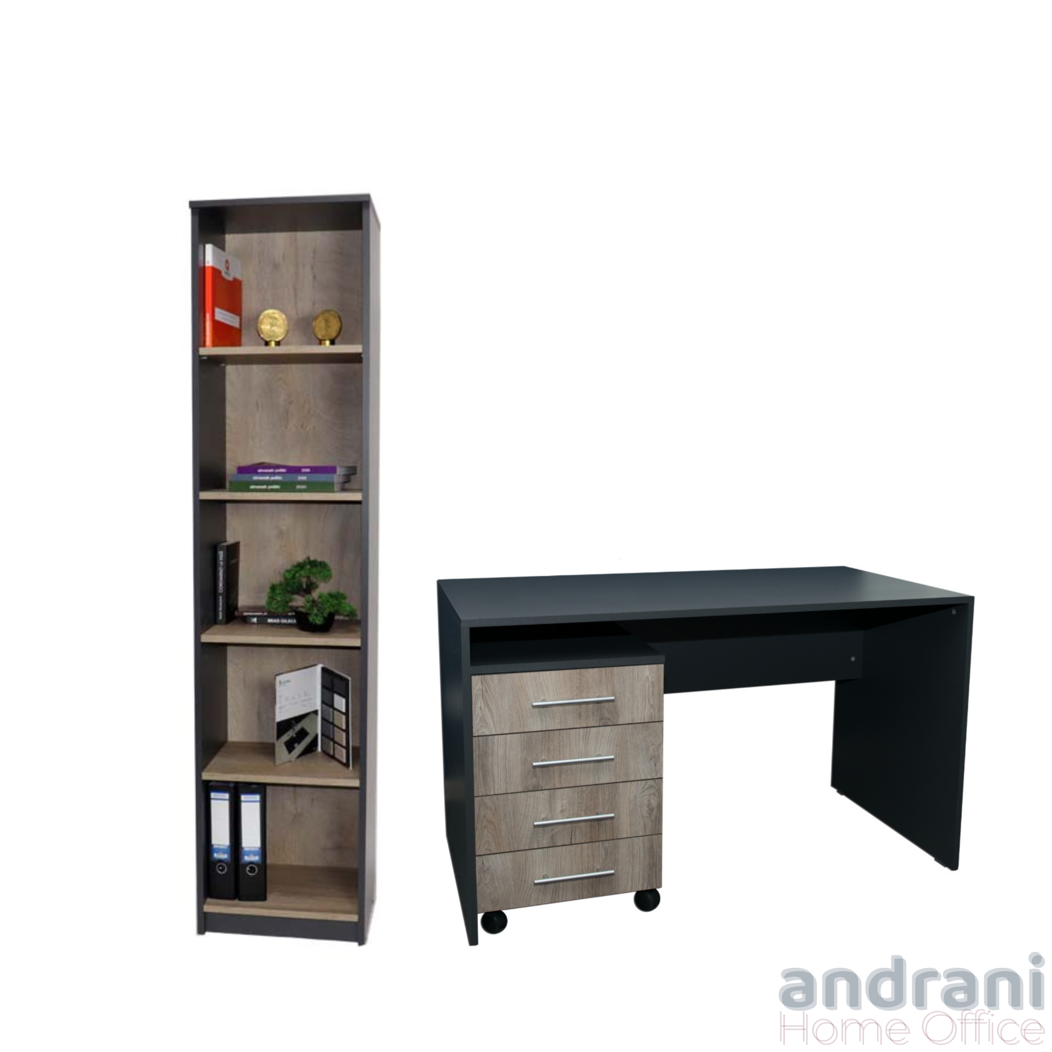 Questo sistema di arredo ufficio combina funzionalità, ordine e design contemporaneo, offrendo una soluzione completa per spazi di lavoro moderni. La composizione include una scrivania spaziosa con cassettiera integrata e una libreria verticale, concepite per ottimizzare l’organizzazione e migliorare l’efficienza quotidiana.
