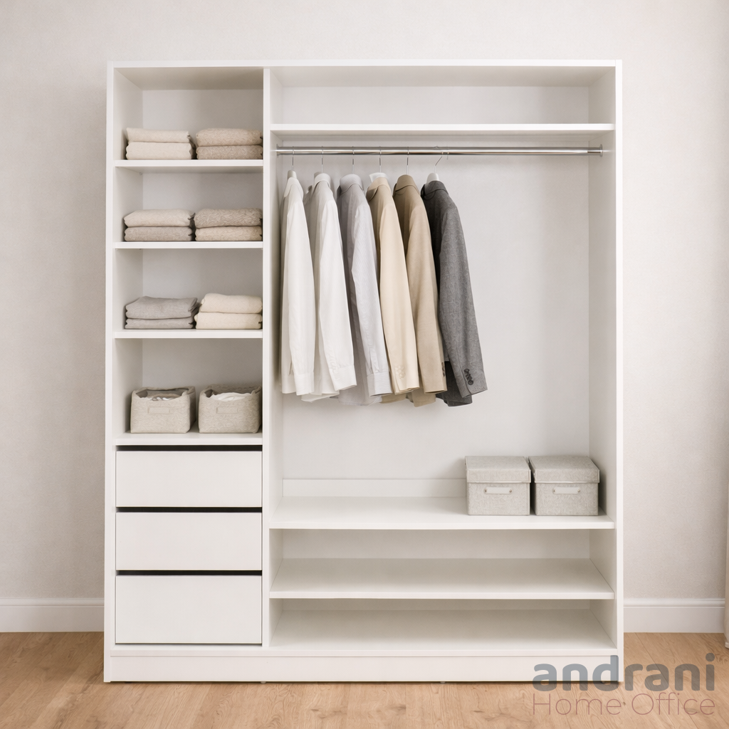 La suddivisione interna comprende una combinazione di ripiani e barre appendiabiti, che consente una facile organizzazione degli abiti per categorie – capi piegati, capi appesi e accessori. Questo facilita il mantenimento dell’ordine e un rapido accesso agli oggetti necessari.