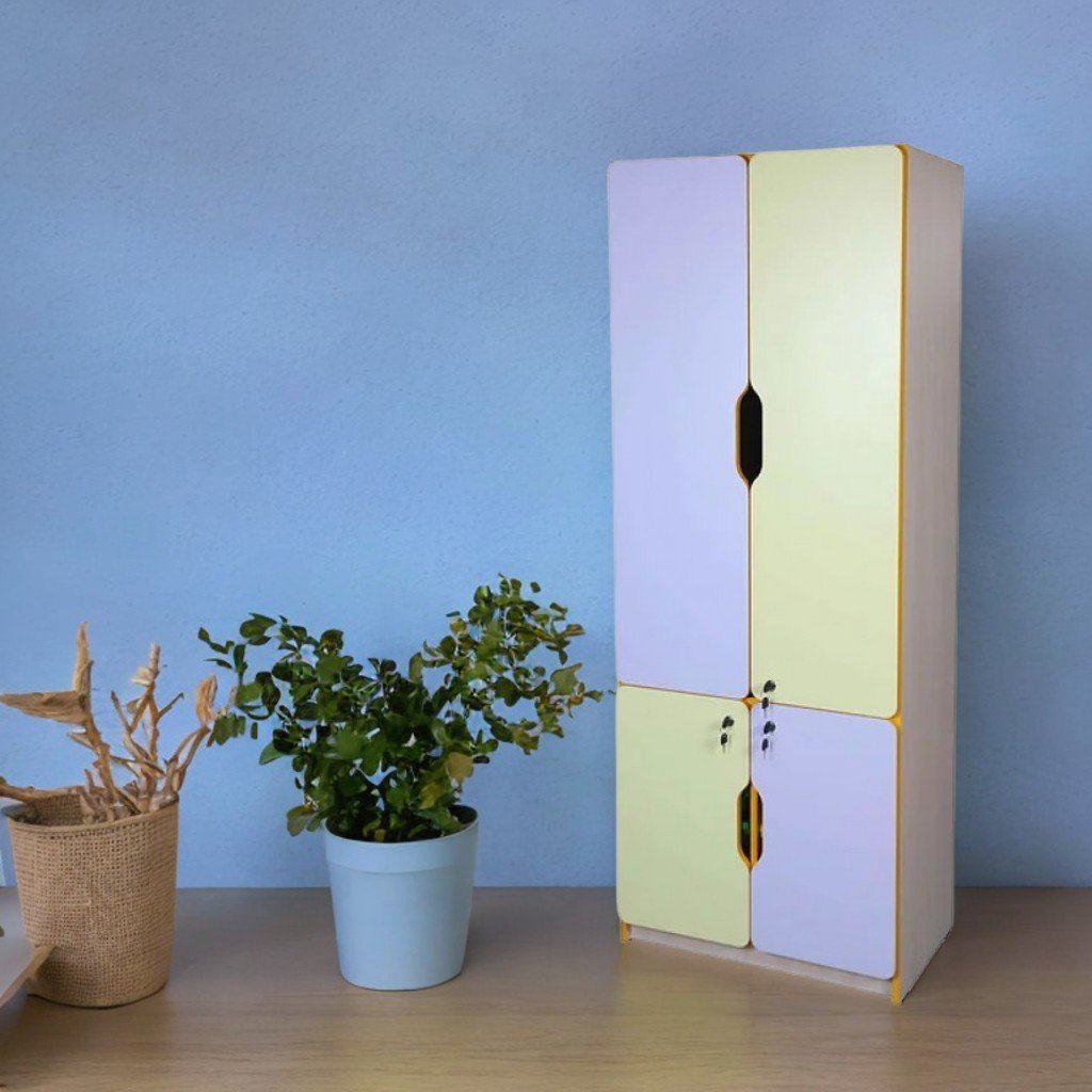 Mobile - dimensioni: 696×410×1885 mm, peso: 56,49 kg. Truciolare melaminico 16 mm, retro in PFL bianco 3 mm. Facciata gialla con bordo ABS 1 mm. Interno con appendiabiti e 4 ripiani. Include 4 contenitori in plastica Gratnells N1 (verde e rosso). Ante con angoli arrotondati e foro per l'apertura. Corpo: rovere chiaro. Facciate: gelsomino/lavanda. Fissaggio sicuro, assemblaggio con elementi speciali.