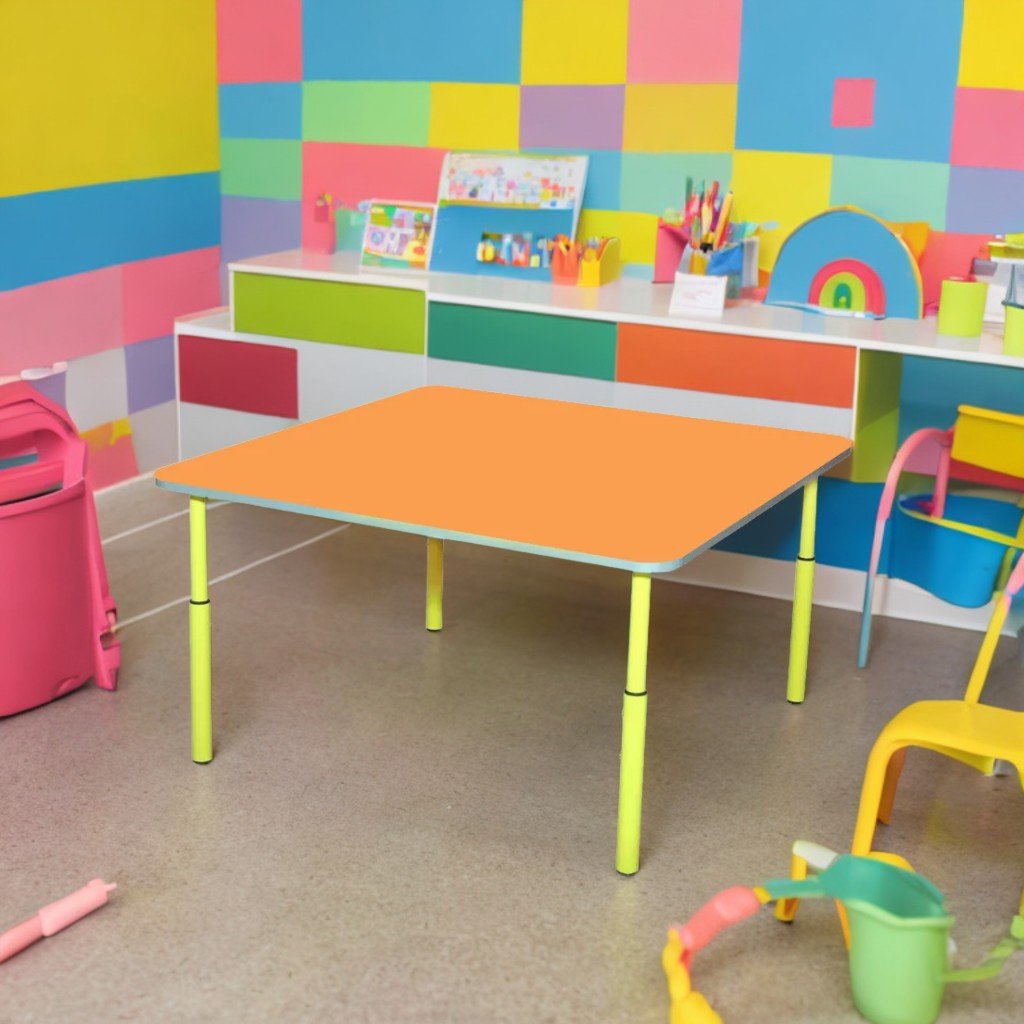 Tavolo quadrato, robusto e sicuro, ideale per 4 bambini. Il piano in truciolare melaminico da 16 mm, con angoli arrotondati e bordo in ABS argentato, è montato su una struttura metallica con profilo tondo, regolabile in altezza (460 / 520 / 580 mm) tramite un sistema telescopico con guarnizioni di protezione. Le gambe sono verniciate elettrostaticamente e dotate di tappi in plastica. Tutti i giunti sono solidi e sicuri con dadi a scomparsa.